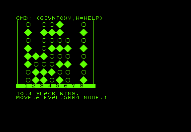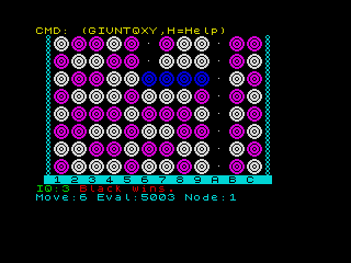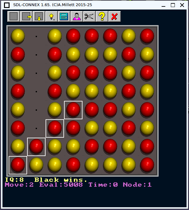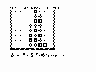 When searching the computer shows the best move, the evaluation for the move, time taken, and level. When the eval is >= 5000 the computer sees a win, when <= -5000 it sees a loss.